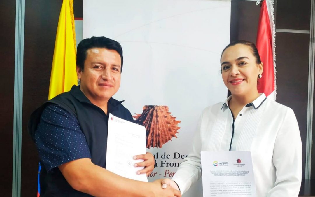 Patricio Montero, presidente del Conagopare Zamora Chinchipe, y Tatiana Sánchez, directora ejecutiva de Plan Binacional de Desarrollo de la Región Fronteriza Ecuador-Perú, el día miércoles 26 de julio del presente año, firmaron Convenio de Cooperación para el desarrollo territorial y el fortalecimiento de la cooperación interinstitucional, en la ciudad de Machala.